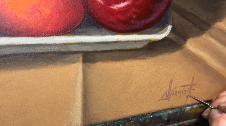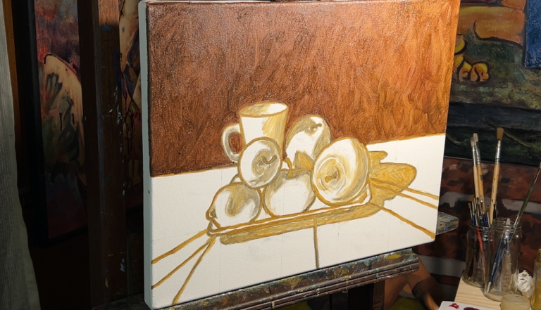 Te voy a mostrar el paso a paso de cómo pintar un cuadro al óleo de naturaleza muerta, desde la preparación del lienzo, la mezcla de colores y primeras pinceladas hasta terminar el curso con tu obra finalizada.
